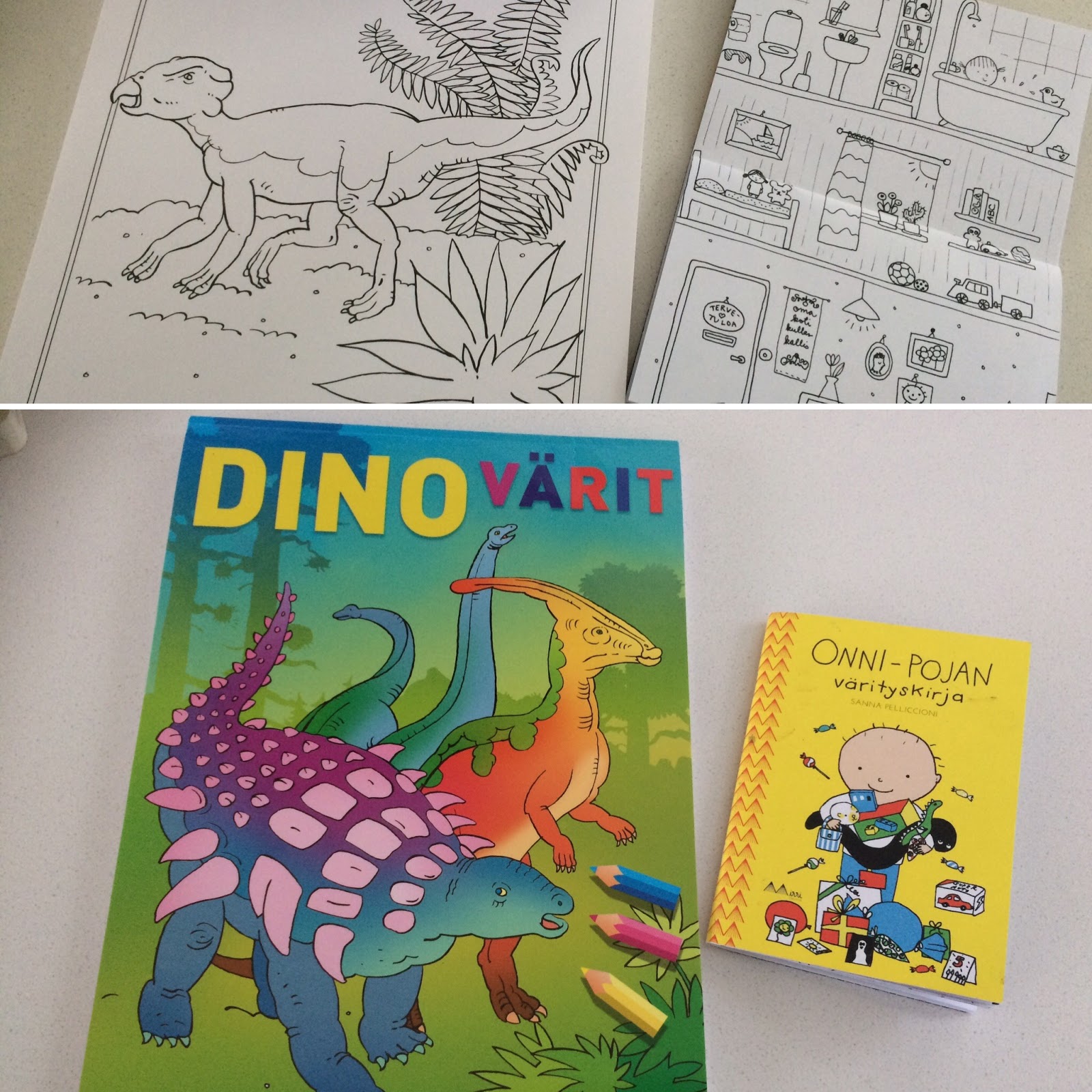 1. Etenkin keskimmäisen lapsemme suosikkihahmo, Sanna Pelliccionin ihana Onni-poika seikkailee kirjojen lisäksi myös värityskirjassa. Onni-pojan värityskirja (Mirri Creative) on niin pienikokoinen, että se mahtuu mukaan käsilaukkuun, josta se on helppo kaivaa esiin vaikka ravintolassa ruokaa odotellessa ja antaa lasten väritellä Onni-kuvia siinä istuessaan. Pienen koon takia osa värityskuvista on niin pieniä, että niiden värittämiseen vaaditaan tarkkuutta ja kärsivällisyyttä.